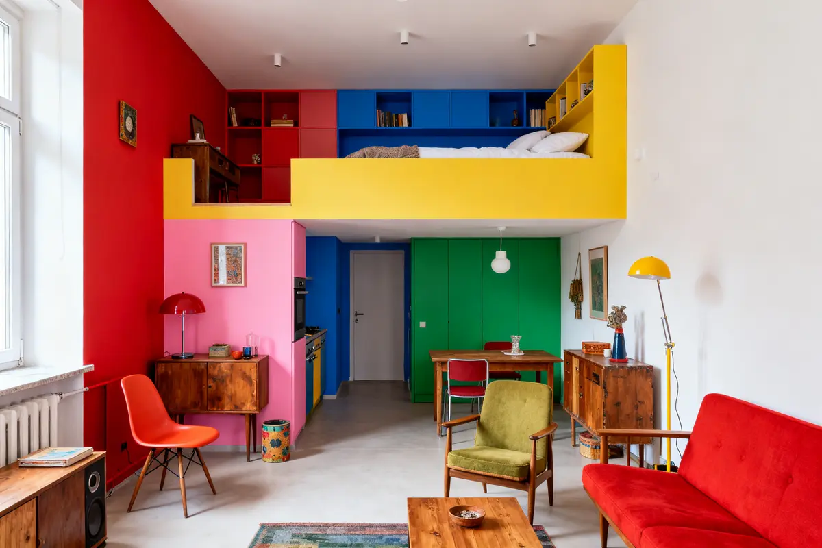 Mini‑casa di 41 mq: i colori accesi ti travolgono (l’interno è incredibile)